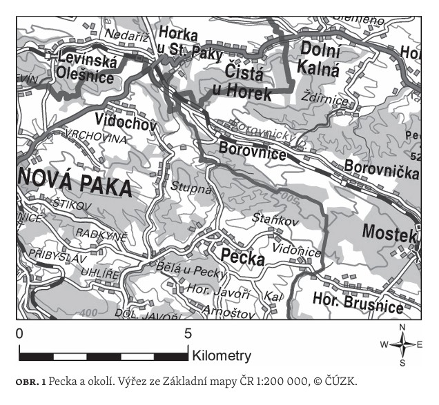 Naprostá většina dotazovaných pamětníků správně postřehla německý původ jména numinózní bytosti. Až do konce druhé světové války představoval mikroregion Peckovska oblast česko-německého jazykového rozhraní. Tuto česko-německou jazykovou i etnickou hranici přirozeně nesmíme vnímat jako ostrou, zřetelně dělící linii mezi dvěma odlišnými, etnicky zcela homogenními oblastmi, nýbrž jako relativně širokou zónu, v níž se obě etnické skupiny i jejich atributy vzájemně různou měrou prolínaly a docházelo mezi nimi k vysoké míře sociální interakce (Siwek 1996; týž 1999). V řadě obcí žilo české a německé obyvatelstvo pospolu, existovaly tu smíšené česko-německé rodiny a mnoho občanů znalo oba jazyky. Sousední obce Stupná (2 km severozápadně od Pecky), Vidochov (4,5 km severozápadně od Pecky) a Borovnice (3 km severně od Pecky) již byly osídleny německou většinou, což sehrálo neblahou roli při záboru sudetského území po podepsání Mnichovské dohody na podzim 1938 (Turčín 2001: 1, 7). Rámcové geografické vymezení česko-německé jazykové hranice tak představuje pomyslný oblouk, jenž od západu (Bělá u Pecky, Štikov, Stupná) obkružuje Pecku po severní straně (Nedaříž, Vidochov, Borovnice, Borovnička) až k východně položené Horní Brusnici (obr. 1). Toto geografické vymezení jazykového rozhraní ostatně zachycuje i Josef Štefan Kubín v úvodu ke svým Lidovým povídkám z českého Podkrkonoší: Úkrají východní: