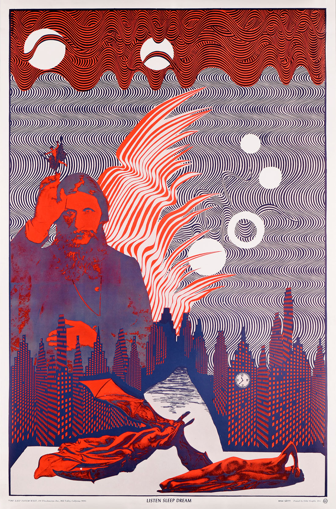 Jay Babcock, Richard Pleuger a já jsme tam jeli autem z Los Angeles, abychom prozkoumali historii Wilfrieda Sättyho (1939–1982), mistra koláží, autora psychedelických plakátů, návrháře obalů desek a ilustrátora knih. Strávili jsme 24 hodin jízdou po oblasti zálivu: nejprve do Petalumy, kde jsme se setkali s Sättyho přítelem a uměleckým spolupracovníkem Davidem Singerem, který je sám o sobě vynikajícím kolážistou; poté do Berkeley, kde jsme hovořili s Walterem Medeirosem, správcem Sättyho pozůstalosti a jedním z předních odborníků na psychedelickou plakátovou scénu; a nakonec do North Beach, kde jsme našli dům v Powell Street, kde Sätty žil a pracoval v 60. a 70. letech.