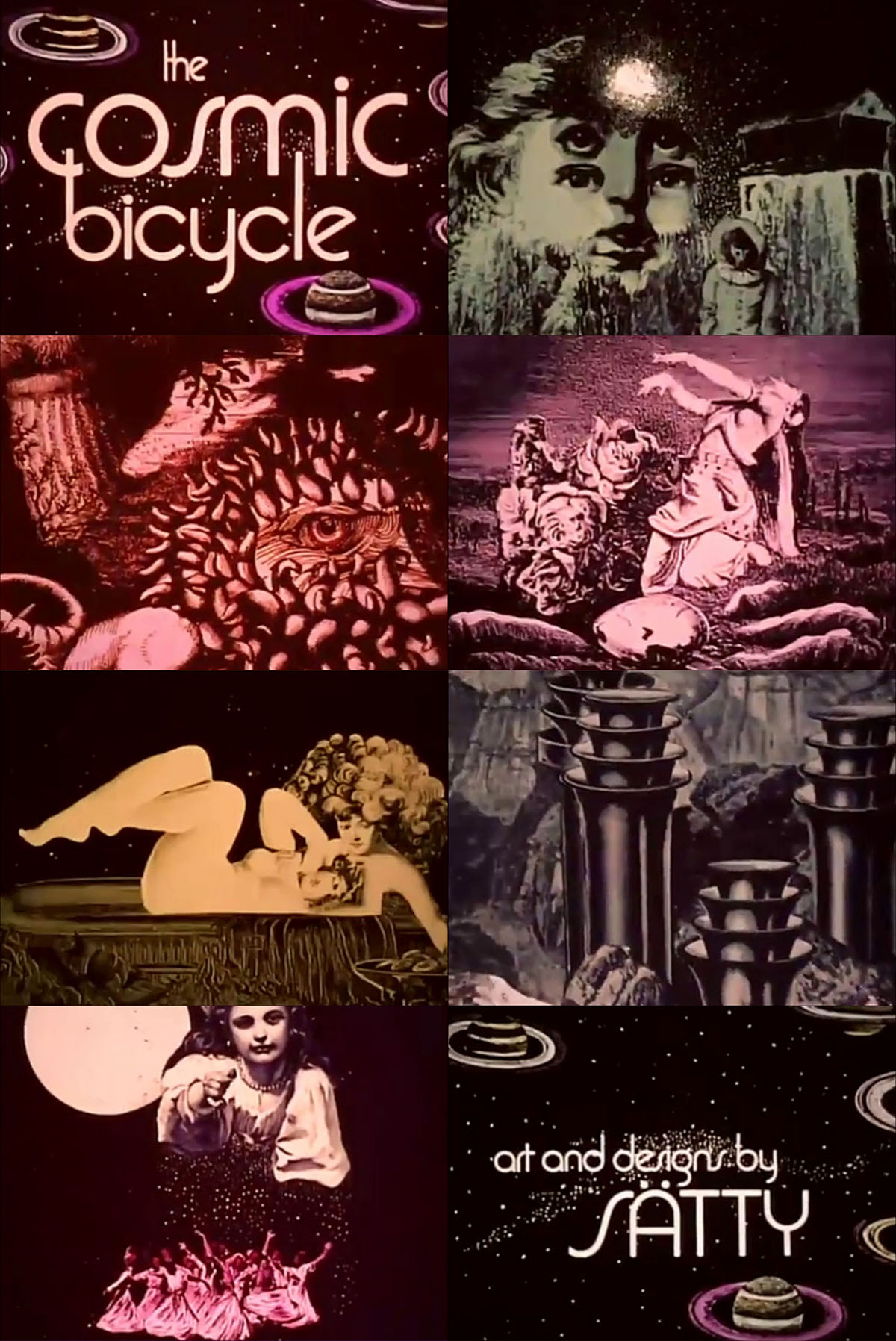 Cosmic Bicycle je také název čtyřminutového animovaného filmu, který oživuje některé z obrázků Sättyho z knihy. Před lety jsem sem dal odkaz na kopii tohoto filmu, ale ten odkaz už nefunguje, takže ho sem dávám znovu. Je to podivný krátký film, v němž jsou umělecká díla zpracována solární technikou a poté jsou jejich části přesouvány za doprovodu elektronické hudby. (Jako obvykle u Vimeo se dnes musíte přihlásit, abyste si ho mohli prohlédnout.) Film režíroval Les Goldman, producent animovaných filmů, o kterém jsme zde nedávno psali v souvislosti s krátkým filmem The Hangman (1964), který natočil s Paulem Julianem. Goldmanův vlastní film působí ve srovnání s ním téměř amatérsky, ale hudbu k němu složili Paul Beaver a Bernie Krause, průkopníci v používání Moogu. Album Gandharva od Beavera a Krauseho má jeden z nejlepších obalů od Sättyho, s titulním písmem od Davida Singera. Filmová hudba není zdaleka nejlepší, jakou tato dvojice vytvořila – dokonce bych ji popsal jako poněkud otravnou –, ale je dobré vidět, že se jejich spojení se Sättym posílilo.
